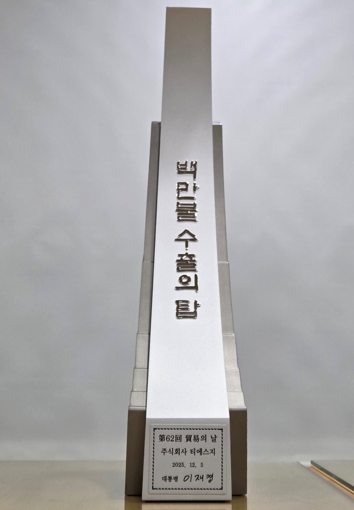 [2025년 12월 5일] – 주식회사 티에스지(대표이사 이병순)는 5일 열린 ‘제62회 무역의 날’ 기념식에서 ‘백만불 수출의 탑’을 수상하는 영예를 안았다.